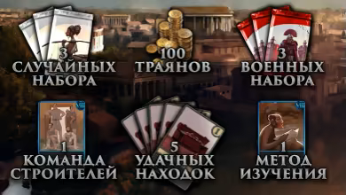 Стартовый набор Steam для новых игроков, которые хотят быстрее добиться успеха в Romans: Age of Caesar. Он даст вам фору в гонке за корону, чем бы вы ни хотели заниматься: хозяйством, политикой или войной. В набор входят 100 траянов, 3 набора случайных карт и 3 набора военных карт, а также 7 бонусных карт для ускорения изучения и помощи в других аспектах игры: