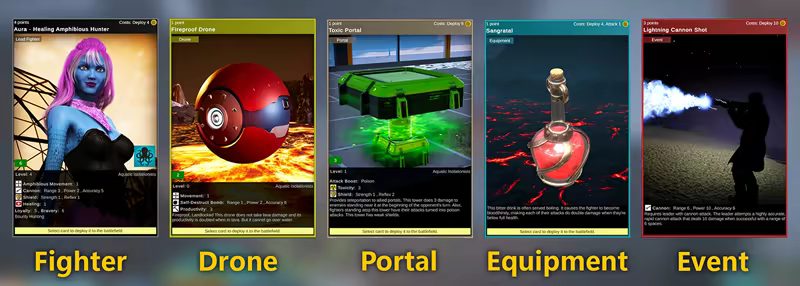 This game includes 160 fighters, 110 drones, 76 portals, 51 equipment, and 9 event cards. While all these cards are available to you in scrimmage and online modes, in campaign mode you start with a small set of cards in your deck and gain more as you progress. Campaign mode is the only mode in which you can mix fighters from different factions into the same deck.