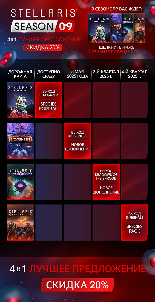 Возьмите будущее галактики в свои руки со Stellaris: Season 09. Станьте великим генетиком, раскройте тайны Покрова и повелевайте инфернальными порождениями пекла. В этом комплекте расширений вы найдете беспрецедентно глубокие механики и истории, рассчитанные на целый год.