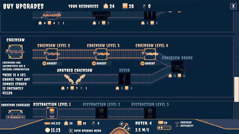 Each run offers a fresh experience with procedurally generated tracks. Choose from one of three unique journeys at the start. Go slow and steady, gather resources, upgrade your train, and prepare for escalating waves of zombies. Defeat the boss and reach the journey’s end to claim victory!