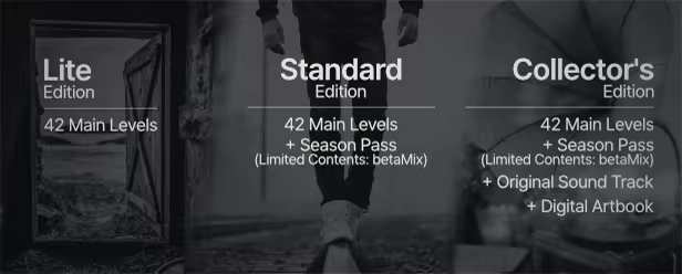 When the full game launches, you'll choose between three editions: Lite Edition(42 main levels), Standard Edition(42 main levels + seasonal content access : Season Pass), and Collector's Edition(all of the above + Original Soundtrack + Digital Artbook). DLC components will also be available for individual purchase: Season Pass , Digital Artbook, Original Soundtrack.