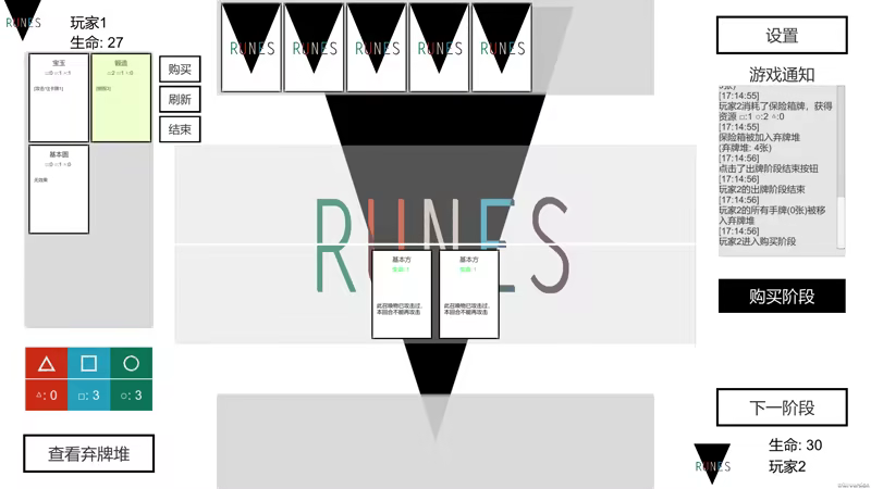 符文桌游的电子版demo,一款带有卡牌构筑要素的双人对战游戏,双方玩家拥有30点生命值,双方玩家起始拥有相同的手牌,可以通过将它们变为费用购买更高级的卡牌或是直接使用它们,率先将对方生命值归零的一方可以获得游戏胜。