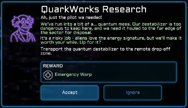 Goofy quest system featuring missing coffee machines, unstable science, and space diners