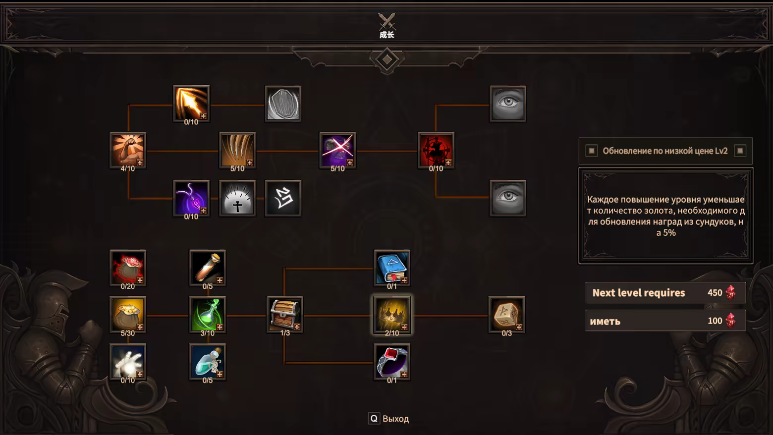 Метапрогрессия — Очки, заработанные в испытаниях, можно использовать в холле для постоянного усиления персонажей.