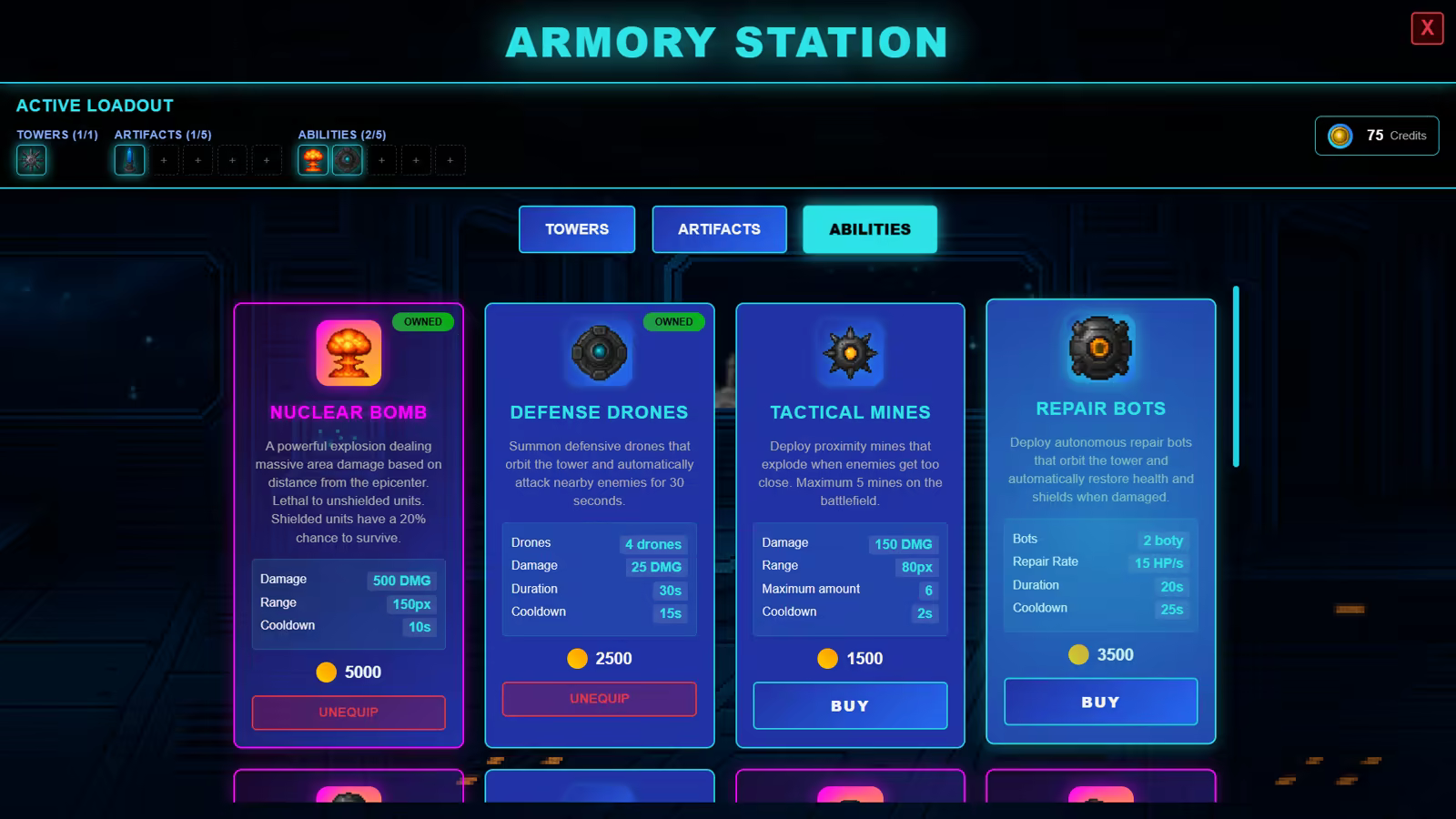 🚀 Глубокая система прогрессии — Магазин с башнями, артефактами и навыками для покупки.