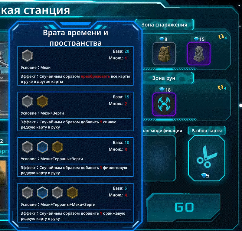 На космической станции вы можете покупать карты, снаряжение и руны, разбирать карты и даже улучшать их!