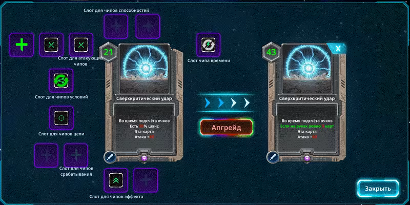 Сильная карта, которую трудно активировать из-за сложных условий? Не беспокойтесь! Меняйте условия активации, добавляйте эффекты и превращайте даже простые карты в мощные с помощью улучшений!