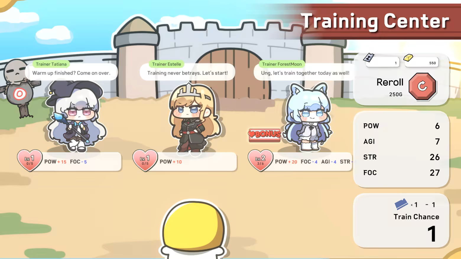 Spend a training ticket to pick one of three randomly presented training options and strengthen your stats.