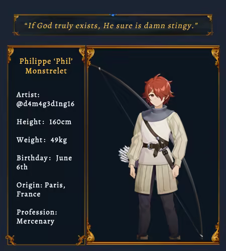 *Inspired by Marshal Jean Poton de Xaintrailles of France; surname pays tribute to chronicler Enguerrand de Monstrelet.
