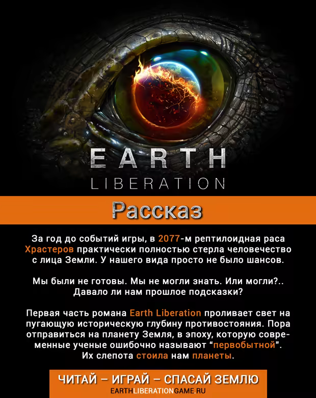 За год до событий игры, в 2077 году рептилоидная раса Храстеров практически полностью стерла человечество с лица Земли. У нашего вида просто не было шансов. Мы были не готовы. Мы не могли знать. Или могли?.. Давало ли нам прошлое подсказки? Первая часть романа Earth Liberation проливает свет на пугающую историческую глубину противостояния. Пора отправиться на планету Земля, в эпоху, которую современные ученые ошибочно называют “первобытной”. Их слепота стоила нам планеты.