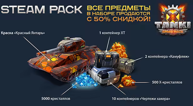 Tanki X — это многопользовательский экшен, в котором танки — не ползущие груды металла, а стремительные боевые машины. Непрекращающийся азарт битв, драйв, невидимые танки, мины-пауки, дроны-турели — вот лишь несколько примеров того, что делает игру особенной. Steam pack собран таким образом, чтобы его обладатели получили быстрый доступ ко всему, что выделяет игру из жанра. Гибкий состав набора подойдет любым игрокам — от тех, кто не захочет тратить время на разблокировку пушек, корпусов или модулей, до тех, кому нравится тюнинг внешнего вида танка или таких, кто ищет выгодное спецпредложение с популярными предметами и игровой валютой.